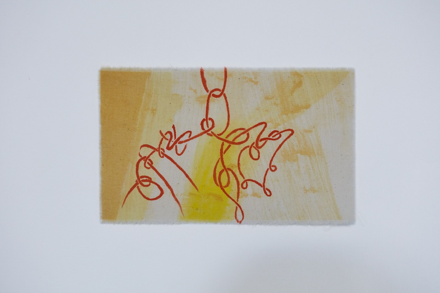 Softening thearchitecture of multiple building facades in the gallery’s neighborhood, theoutdoor installation of paintings knots a visual and somatic dialogue betweenthe textile works and the often hard surfaces of the buildings. There is anunexpected meeting point in the hanging of the works while the architecturalboundaries are swallowed by the large cavity of the canvases. The outdoorstextiles inhale and exhale the environment they are conceived and exhibited in,relinquishing any possible form of control over the canvases. She does not usemore than two colours in her works, and yet the bright and flaxen hues, theorganic lines and creatures, the embedded movement dwell in a collective bodythat is not only hers, but the surroundings’ also.