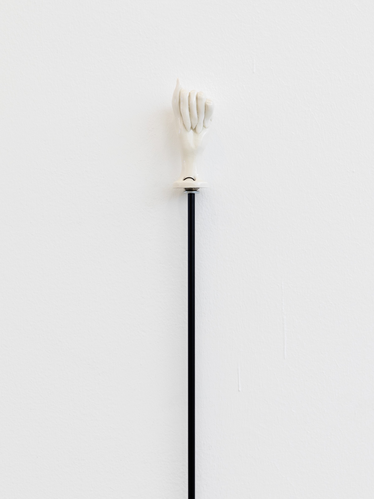 If the exhibition opens by insisting on memory as a spectral engine, the works gathered here unfold a vocabulary of organs, fragments, and gestures that articulate this haunting in material form. Paulo Wirz casts the eye as both relic and prosthesis, bronze turning the act of looking into an object severed from its bearer, while Nana Wolke disperses the gaze until it hovers outside the body, painting and installation staging an unbodied voice that cannot be pinned down. Indriķis Gelzis offers camouflage as a temporal trick, teeth doubling as reflective surfaces through which presence becomes a delayed echo, just as Irina Gheorghe develops small-format works where human figures meet nature in scenes of gardens and parks, shifting between wild and domesticated, conjuring a hypothetical future of ecological catastrophe rather than a harmonious bond with the natural world, decomposing perception into sedimentary layers. Peleș Duo collages hands and colors into impalpable touch, while Man Yau and Andreea Anghel expand the hand’s agency across utensils and microphones, daily objects that register the body by absence as much as by imprint.